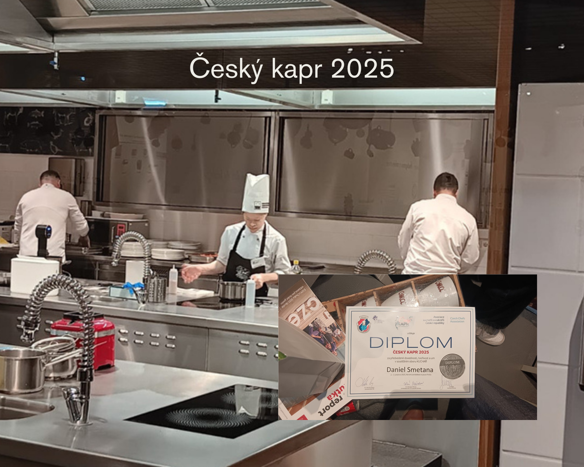 V úterý 2.12. se Daniel Smetana zúčastnil soutěže Český kapr, do které se v rámci korespondenčního kola dostalo pouze 10 nejlepších kuchařů v ČR. Soutěž se konala v Národním zemědělském muzeu pod záštitou AKC ČR. Dan se do přípravy jeho soutěžního pokrmu s názvem “Mosaika z kapra s estragonem, kefírovou omáčkou a fazolovým chipsem s višněmi” pustil s velkou vervou a kuráží s cílem porazit ostatní soutěžící. Během příprav provázela Dana nervozita, ale nenechal se tím ovlivnit a snažil se podat maximální výkon. Dan se sice nakonec nedostal na pomyslnou “bednu” vítězů, ale odnáší si spoustu nových a zajímavých zkušeností, které by rád využil v příštím ročníku této soutěže.